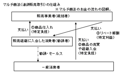マルチ商法(連鎖販売取引)とは、一般消費者に商品(健康食品や化粧品など)を販売する権利(代理店、ディストリビューター)を認めて、販売組織への登録(商品の購入が前提条件となることが多い)を促し、その売上や新規登録会員の獲得数に応じて報酬(リベート、コミッション、ボーナス)を支払う仕組みのことをいいます。消費者が商品の販売組織に加入して、更に販売組織を拡大するために勧誘を続け、組織の下部人数を増やしていくピラミッド構造を基本形としています。